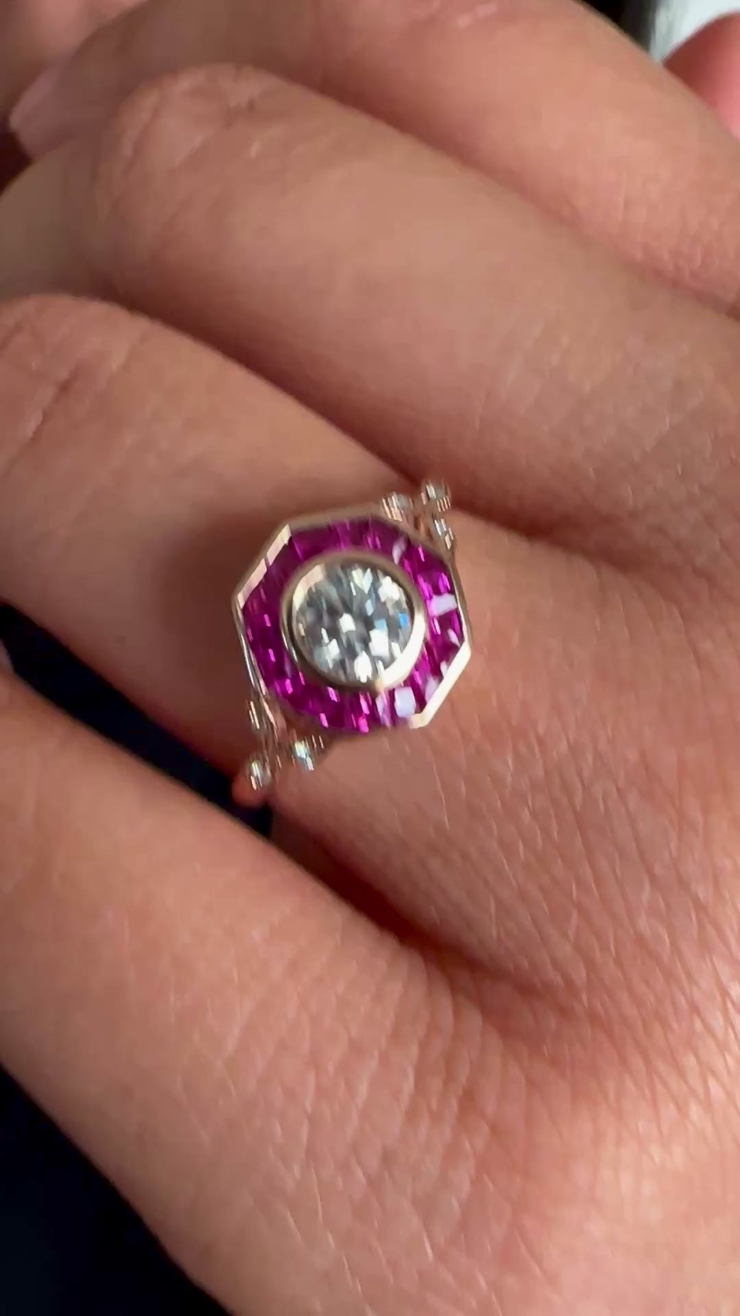 This exquisite 9k rose gold ring showcases a harmonious blend of premium gemstones  Moissanite delivers exceptional brilliance and fire, while vivid ruby stones provide striking depth and character. Complemented by natural diamonds, this piece combines modern gemstone innovation with traditional luxury.
