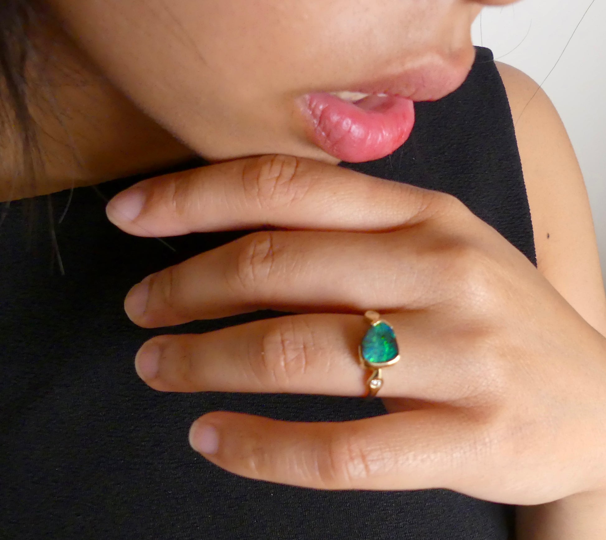 This exquisite 14k gold ring showcases a stunning Australian boulder opal as its centrepiece, complemented by natural diamond accents that enhance its brilliance. Boulder opals are prized for their unique play-of-colour and natural matrix, making each piece genuinely one-of-a-kind.